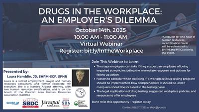Join us for a free virtual webinar on October 14, 2025, from 10:00 – 11:00 AM to learn how employers can address the challenges of drug use in the workplace. Employment law and HR expert Laura Hamblin, JD, SHRM-SCP, SPHR, will share insights on drug testing policies, handling suspected impairment, and the legal implications employers should know. This session is designed for business owners, HR professionals, and managers.