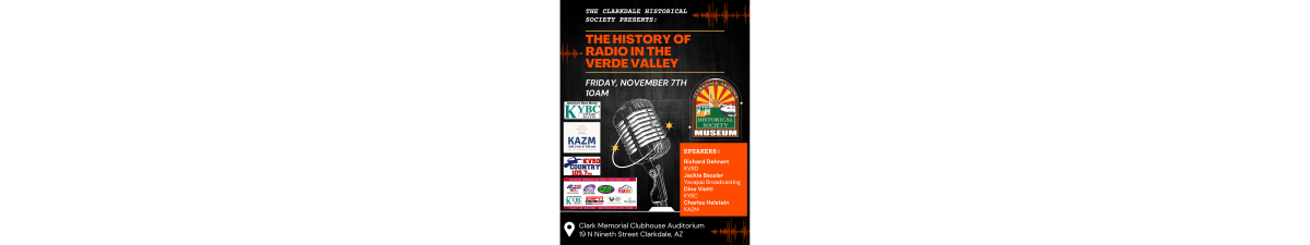 The History of Radio in the Verde Valley Date and Time Friday Nov 7, 2025 10:00 AM - 11:00 AM MST Share × Print Email Add to Calendar Facebook Twitter LinkedIn Tell a Friend × Select Calendar Type × Google Yahoo iCal (Outlook, Apple, or other)